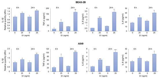 To determine the pro-inflammatory effects of S1 spike protein on BEAS-2B and A549 cells, we measured the levels of IL-1β, TNF-α, IL-6, and IL-8, crucial inflammatory cytokines in COVID-19 [1]. We found that both 25 ng/mL (Figure 2) and 100 ng/mL (Figure S2) of S1 protein induced a significant increase in all the considered cytokines compared with unexposed cells at 6 and 24 h post-exposure. Since an inflammatory status was induced in both cell models with 25 ng/mL S1 and it was more evident 24 h post-S1 treatment, we decided to perform subsequent experiments by exposing cells to these experimental conditions.