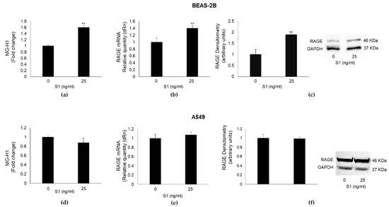 MG-H1, a major AGE derived from the spontaneous reaction of MG with the arginine residues of proteins [4], is a potent inducer of inflammatory pathways, usually through its binding to the receptor RAGE [7,8]. In the attempt to evaluate the potential involvement of both MG-H1 and RAGE in S1-induced inflammation, we detected MG-H1 levels and RAGE expression in BEAS-2B and A549 exposed to 25 ng/mL S1 for 24 h. We found that S1 induced a significant increase in MG-H1 (Figure 3a) and RAGE mRNA (Figure 3b) or protein (Figure 3c) levels in BEAS-2B cells, while it induced a modest decrease in MG-H1 levels (Figure 3d) without affecting RAGE mRNA (Figure 3e) or protein (Figure 3f) expression in A549 cells. These results suggested that the MG-H1/RAGE axis could represent a novel S1-induced pro-inflammatory pathway in human bronchial BEAS-2B cells.