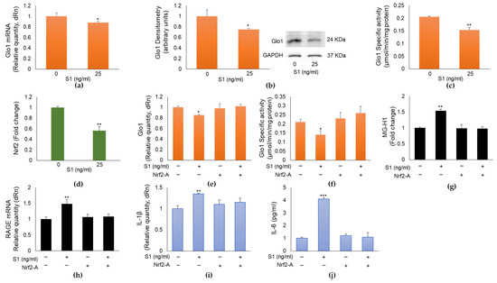 SARS-CoV-2 S1 spike protein controls MG-H1/RAGE (hydroimidazolone/receptor for advanced glycation end products) proinflammatory pathway through Nrf2-dependent glyoxalase 1 (Glo1). Glo1 downregulation in human bronchial BEAS-2B cells. BEAS-2B cells were exposed to 25 ng/mL S1 for 24 h and (a) Glo1 mRNA, (b) protein expression, (c) specific activity, evaluated by real-time RT-PCR, Western blot (WB) and spectrophotometric assay, respectively, and (d) Nrf2 nuclear expression, evaluated by a specific assay, were studied. Pretreatment with 10 µM Nrf2-A (Nrf2 activator) rescued (e) Glo1 expression and (f) activity, reduced (g) MG-H1 intracellular accumulation, measured by a specific ELISA kit; (h) RAGE expression, evaluated by real-time RT-PCR, as well as inflammation, evaluated by IL-1β (i) and IL-6 levels (j), by real-time RT-PCR and ELISA, respectively, compared with S1-challenged cells. MG-H1 absolute levels (µg/mL) in order (mean ± SD): 0.54 ± 0.012, 0.83 ± 0.022, 0.529 ± 0.044, 0.527 ± 0.023. GAPDH (Glyceraldehyde-3-phosphate dehydrogenase) was used as internal loading control for WB normalization. Data represent mean ± SD (n = 3). * p < 0.05, ** p < 0.01, *** p < 0.001. Whole blots are shown in Figure S5.