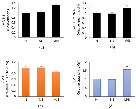 Methylglyoxal-derived hydroimidazolone (MG-H1), RAGE (receptor for advanced glycation end products), Glo1 (Glyoxalase 1), and IL-1β expression in nasopharyngeal swabs of SARS-CoV-2-infected patients at different clinical severity of COVID-19. MG-H1 levels (a) were measured by a specific ELISA kit (MG-H1 absolute levels (mean, µg/mL, ± SD) in the following order: 0.65 ± 0.078, 0.67 ± 0.039, 0.845 ± 0.0182); gene expression of (b) RAGE, (c) Glo1, and (d) IL-1β was evaluated by real-time RT-PCR. N: SARS-CoV-2-negative group; NS: SARS-CoV-2-positive with non-severe COVID-19 disease; M/S: SARS-CoV-2-positive with moderate/severe COVID-19 disease. * p < 0.05, ** p < 0.01.