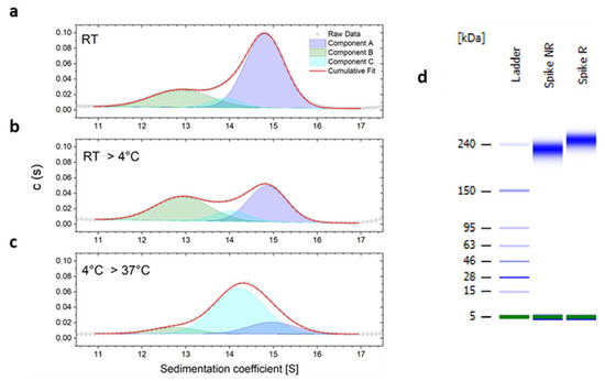 (a) AUC sedimentation coefficient distribution of D614G Spike protein measured at 20 °C after pre-incubation at a| room temperature, (b) 4 °C and (c) 4 °C then 37 °C. Results of deconvolution shown with various colours—Components A, B, C, (d) SDS-PAGE of the D614G Spike protein sample used for AUC under non-reducing (Spike NR) and reducing conditions (Spike R).