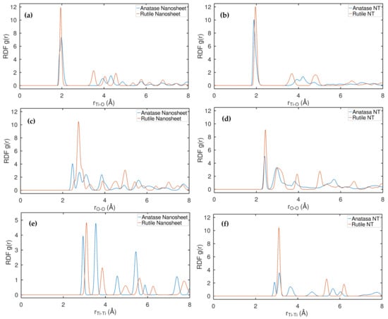 As shown in Figure 1a, a detailed comparison of the structural characteristics of anatase and rutile NSs and NTs at a temperature of 300 k and a pressure of 1 atmosphere was carried out. For these models, periodic conditions were applied in each and every direction. Examining the results, it should be noted that in almost all RDF curves, the peaks of the rutile nanostructures are higher and more dominant than the curves of the anatase nanostructures, both cases having in common that they have regular and very well-defined coordination shells. In the case of Ti-O bonding in both anatase and rutile NSs and NTs, it can be observed in Figure 1a,b that the RDF curves are similar, but two sharp peaks within the 3 Å cut-off radius stand out, which clearly correspond to the Ti-O bonding distances reported in experimental studies [37] for rutile (1.946 Å and 1.984 Å) and anatase (1.937 Å and 1.964 Å), noting that the rutile nanotube peak is slightly further to the right than the anatase nanotube peak. With this first observation, we can ensure that the equilibrium geometry of both the rutile and anatase nanotubes and layers has not lost its crystalline structure, as it is common for the peaks in amorphous structures to be smoothed [38,39,40,41,42]. In this case, this feature cannot be verified; on the contrary, they are very well defined. On the other hand, the silhouette of the RDF curve of the rutile nanolayer with respect to the O-O bond in Figure 1c is very different from the curve of the anatase nanolayer. Within the first 3 Å coordination shell, the rutile nanolayer has one large dominant peak, while the anatase nanolayer has three peaks of intermediate height. With respect to the NTs in Figure 1d, the RDF curves are very similar, with the rutile peaks only very slightly predominating over the anatase peaks. Similarly, one can see that in the Ti-Ti bond, from the second coordination shell onwards, the anatase nanosheet peaks are more dominant than the rutile NS. In contrast, this situation is not found in the NTs in Figure 1f, as upon inspection it is found that there are only three dominant rutile NT peaks and, in contrast, for anatase NT there are at least seven regular peaks. Another remarkable aspect is that in the RDF curve in the Ti-O bond, the anatase nanolayer and the anatase tube decrease their likelihood factor by despite having the same number of atoms in the first shell coordination; we cannot verify this property in the rutile nanolayer and the rutile nanotube because the crystal structure is different and contains fewer atoms.