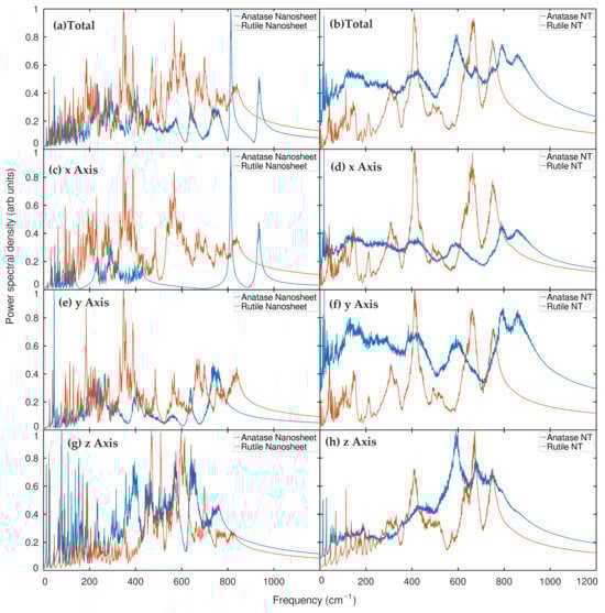 Phonon density of states of anatase and rutile nanostructures obtained from the Fourier transform of the velocity autocorrelation. (a) Total PDOS of anatase nanosheet and rutile nanosheet. (b) Total DOS of anatase nanotube and rutile nanotube; PDOS of anatase nanosheet and rutile nanosheet (c) x-axis (e) y-axis, (g) z-axis; PDOS of anatase nanotube and rutile nanotube (d) x-axis (f) y-axis, (h) z-axis.