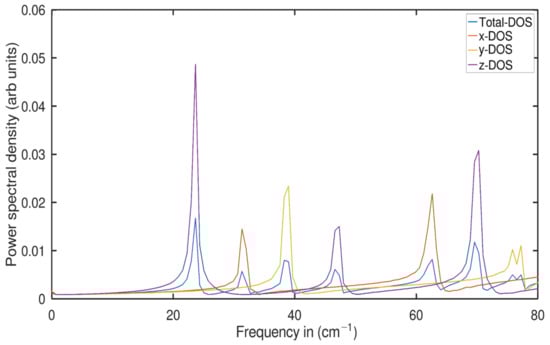 The discovery that even the peak frequencies of anharmonic modes generally correspond to the low-frequency modes with which they are most closely associated (see Figure 3) has already been mentioned. Low-frequency modes indicate the globular movement of the all-atom system. We try to observe the harmonic behavior of rutile nanosheets in the very low frequency range of 0–80 cm, which corresponds approximately to a value of 2 THz, when one part or group of molecules oscillates and the other part of the system is at rest, so this participation can also occur in certain groups of atoms in certain dimensions as we see that in the case of the rutile nanosheet, periodic oscillations were observed. The first frequency was close to 20 cm in the z dimension, the second was close to 30 cm in the x dimension, and the third was close to 40 cm in the y dimension. The situation is similar for the other conformational modes, although we must emphasize that these frequencies may not be as precise as a Hessian-based harmonic approach to determine the best possible lowest natural frequencies. Despite the fact that these modes are our most consistent and possibly comparably lowest frequencies, an important significance of this plot is that there were six peaks for the entire PDOS case, and likewise, each dimension shared two peaks, indicating the softness of the surface phonon oscillations.