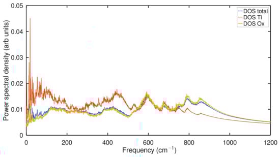 During the last few years, the extraordinary physicochemical properties of titanium dioxide (TiO) nanoparticles have aroused the interest of leading researchers in the scientific community and have enabled a breakthrough in major technological applications [1]. TiO nanoparticles have been the subject of extensive research due to their remarkable optical properties, which have led to their application in various fields of technology, including photocatalysis [2,3,4], sensors [5,6], Li and H storage [7,8], rechargeable batteries [9], biomedical applications [10], photovoltaic power generation [2] and in numerous industrial products, such as paints, sunscreens, cosmetics, food (as a colourant) [11], toothpaste and even pharmaceuticals [12]. In the face of this diversity of application, major concerns have arisen about the serious thermal challenges in the fabrication and utilization of TiO nanotubes (TNTs), resulting from localized electrical, optical, and mechanical overheating. While there have been some studies of material thermal behavior, structure degradation, efficiency decrease, and mechanical stress failures, there have been few studies of the heat propagation in TNTs that would allow a proper description of the thermal performance of TNTs and an understanding of the thermophysical properties of such TNTs. Indeed, the study of the PDOS in TNTs is important to understand the propagation of heat in these materials because heat transfer through a material depends to a large extent on the material’s ability to store and transfer heat, so the thermal energy through atomic vibrations and the infrared spectrum allow to measure the absorption of energy as a function of the frequency of the infrared radiation. Faced with this research challenge, the experimental path is complex and costly, while the computational approach appears as a viable and much cheaper alternative [13] for the study of these properties in TNTs.