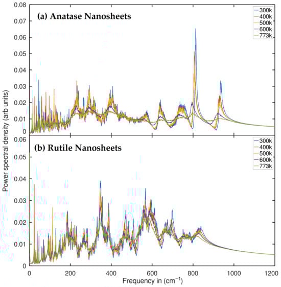 All conformational modes display a different vibrational order in the region of 0–9 THz, regardless of temperature fluctuation. The anatase phase exhibits horizontal as well as dense vibrational states, indicating that the surface phonon behavior and the associated softening effect are different. This implies that the phonon properties of TiO nanosheets that are structurally (001 projection) and geometrically similar are distinct. Rutile nanosheets exhibit increasing mode order, while anatase nanosheets exhibit relatively dense peaks. If the temperature effect is also taken into account, we can see that even if the intensity is unchanged, it is clear that the anharmonicity significantly affects the phonon modes. In particular, a red shift, as would be expected from an increase in temperature, is visible for 400, 500, and 600 K in the range of 200 cm to 800 cm, as shown in Figure 5.