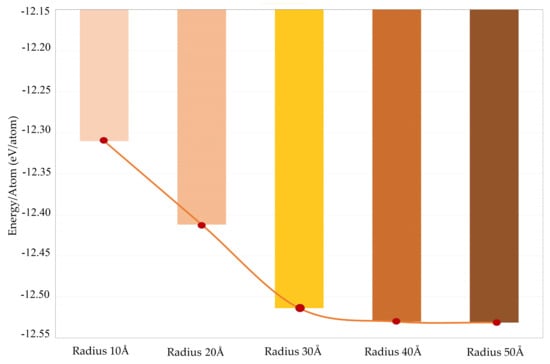 In accordance with previous research [54,55,56,57,58,59,60], it has been shown that the average total energy of TiO nanotubes is correlated with their diameter. This was corroborated in our calculations performed on tubes of different sizes (10 Å, 30 Å, 40 Å, 50 Å). Figure 6 shows that the total energy of TiO TNTs is inversely proportional to their diameter, converging toward a maximum diameter of around 50 Å. This is because the diameter of the tube describes its curvature, and more curved TNTs may have atoms with a more distorted geometry, requiring more energy to keep the structure stable. Additionally, steeper bends in a nanotube can generate internal stresses, which also increases the total energy of the structure.