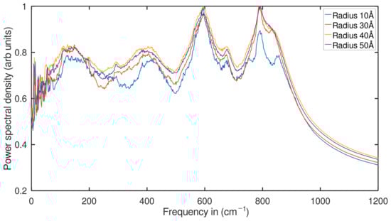 As can be seen in Figure 7, as the radius of the TNTs and thus the number of atoms increases, the PDOS also increases significantly at all frequencies. At low frequencies, we notice that in the case of 3 THz, compared to PDOS of the 10 Å nanotube, the nanotube with 30 Å radius increases by 7.19%, the nanotube with 40 Å radius increases by 11.13%, and the NT with 50 Å radius increases by 16.39%. Similarly, we find that at the frequency of 5 THz, the tubes with the largest radius increase by at least 3% compared to the PDOS of the tube with the smallest radius. Similarly, at the frequency of 10 THz, it was calculated that the PDOS increase in the 40 Å radio nanotube is 14.10%, 16.87% for the 50 Å radio nanotube, and 18.75% for the 30 Å tube NT.