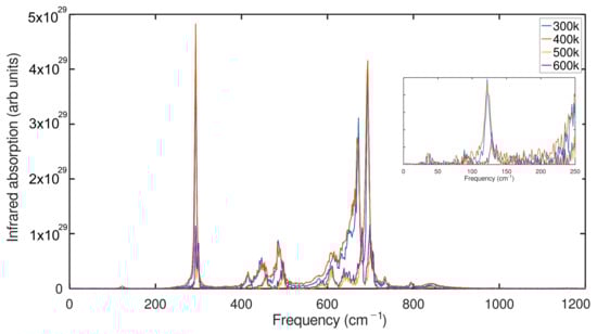 The anatase structure is attributed to the Raman bands in NT -TiO at 127, 153, 201, 253, 414, 473, 519, and 640 cm [61], similar to the experimental observation. Here, we note that these results agree well with our dipole autocorrelated power spectrum, in which it identifies a similar spectral profile and corresponding peaks of the experimental Raman (Figure 8), particularly for the spectral region of 400–800 cm. Moreover, 153, 201 and 253 cm are missing in our dynamical spectra; this is because the anharmonicity of the vibration reduces the intensity of these particular modes, and we also find that there should be a harmonic coupling of these modes of 201 cm and 253 cm, which are harmonically coupled, which is highlighted in the simulated spectra almost at 300 cm. More on this, we could see that a tiny part of the peak is seen at 153 cm (Figure 8), which agrees well with the experimental observation. Moreover, our calculated spectra ensure that all possible frequencies of TiO NT are visible; in order to elucidate each peak of IR frequency in CMD, it might be necessary to treat the modified potential to capture the low frequencies in the range of 0 to 9 THz, which are associated with the localized modes of TiO. In addition, our study could lead to an understanding of the influences of temperature on the absorption factors. Recent Raman spectroscopy results for the conversion of amorphous to anatase NT were heat treated at 450 °C [62]. Whereas the measurement factors for anatase, the peaks associated with 150 cm, 350 cm, 470 cm, and 580 cm, were seen, the amorphous nanotube did not show any of these peaks in their observation. In addition, we note that the inset in Figure 8 shows that the first low frequency corresponding to the experimental Raman of 127 cm is seen at 121 cm for the temperatures of 300 and 400 K; interestingly, the peak shifts to 128 cm at higher temperatures (500 K and 600 K), although the low-frequency modes corresponding to 127 cm are definitely present, and also the intensity of this peak decreases compared to those at 300 and 400 K, suggesting that there is a blue shift due to the temperature increase.