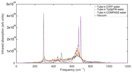 A valuable finding that can be evidenced in Figure 9 is that by immersing an anatase nanotube in three flexible-type water models, the infrared spectrum significantly decreases its intensity, and the peaks of the representative frequencies of the nanotube that in a vacuum are notaries in the water models are smoothed out. This may be largely due to the influence of a large number of water molecules that interact with the anatase nanotube, and as shown in Figure 10a, according to each type of water model, there is a greater number of molecules confined to the tube.