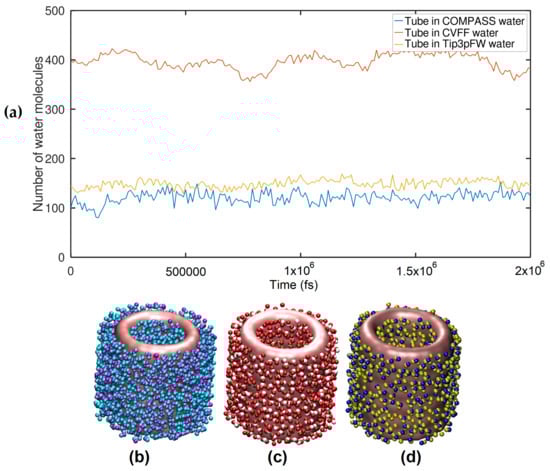 (a) Number of water molecules confined (3 Å) next to anatase NT in different water models, (b) water molecules confined (3 Å) next to anatase NT in CVFF water model, (c) water molecules confined (3 Å) next to anatase NT in Tip3P-FW water model, (d) water molecules confined (3 Å) next to anatase NT in COMPASS water model.
