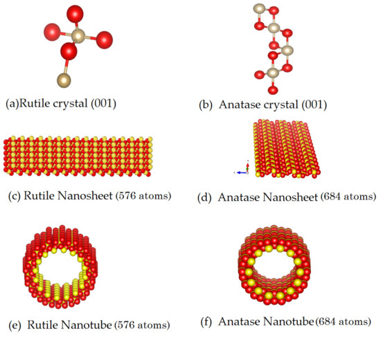 To create several models of TNTs with different geometric parameters (i.e., internal radius and wall thickness) and microstructures (rutile, anatase, or amorphous), we wrap the sheet created by applying the geometric principles in our in-built Python code, which implements the spatial transformation method to convert the sheets into nanotubes. The anatase nanotube’s axis is aligned with the [001] direction, but it is vital to note that the structure of the nanotube was analyzed as if it were an infinite structure in the z dimension. The structures included for this simulation are depicted in Figure 11.