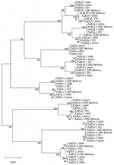 Phylogenetic analysis of FAD2 genes of flax varieties YY5, 3896, Atlant, and CDC Bethune.