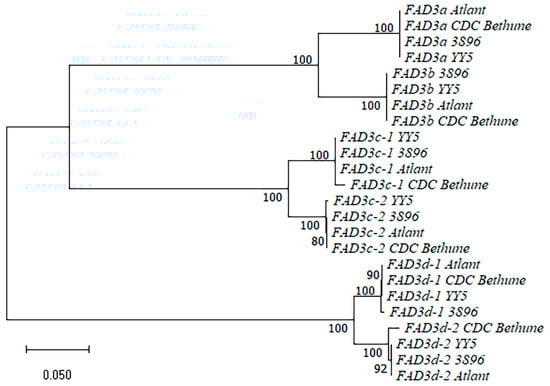Phylogenetic analysis of FAD3 genes of flax varieties YY5, 3896, Atlant, and CDC Bethune.