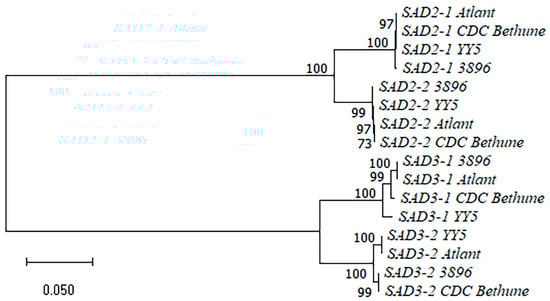 Phylogenetic analysis of SAD genes of flax varieties YY5, 3896, Atlant, and CDC Bethune.