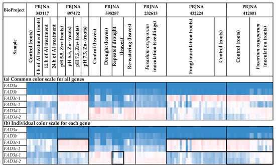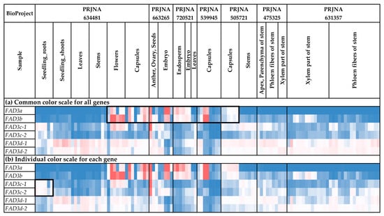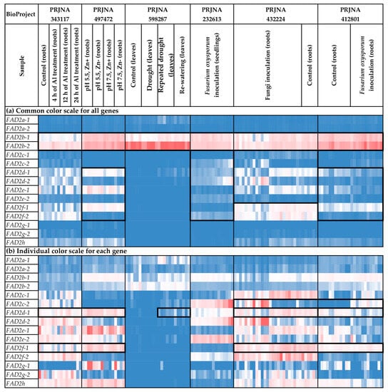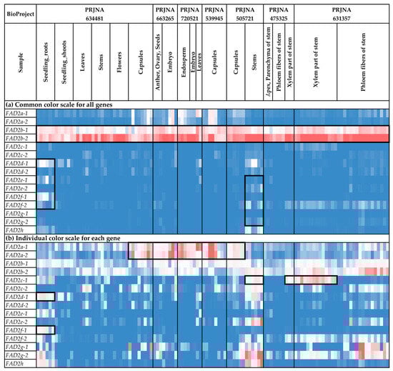 Expression of FAD2 genes in flax plants under different stress conditions. (a) Common color scale for all genes. (b) Individual color scale for each gene. Blue (0.01 × Average)-White (Average)-Red (10 × Average) color scale is used. The expression data for organs/tissues and stress conditions were analyzed together (as in Supplementary Table S2), so the color scale in Figure 4 and Figure 5 is common. Noted gene expression patterns of interest are highlighted in boxes.