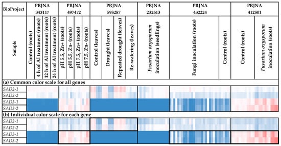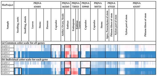 Expression of SAD genes in different flax organs/tissues. (a) Common color scale for all genes. (b) Individual color scale for each gene. Blue (0.01 × Average)-White (Average)-Red (10 × Average) color scale is used. The expression data for organs/tissues and stress conditions were analyzed together (as in Supplementary Table S2), so the color scale in Figure 8 and Figure 9 is common. Noted gene expression patterns of interest are highlighted in boxes.