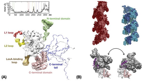 RecA is a 38 kDa protein composed by three domains, an ATP-binding domain (37–270) that exhibits two flexible loops L1 (156–165) and L2 (194–212), a globular C-terminal domain (271–333) ending with a 19 amino-acid (334–352) disordered tail, and a N-terminal domain composed of a terminal helix (1–26) and a 13 amino-acid long (27–36) linker (Figure 3A). The dynamic properties of the RecA protein part of the nucleoprotein filament have been addressed in several studies, with assemblies varying from two to 17 monomers. Molecular dynamics simulations confirmed the speculation based on electron microscopy (EM) observations for the C-terminal domain and crystal structures of DNA-free filaments for the loops, namely that the C- and N-terminal domains and the L1 and L2 loops are mobile with respect to the central ATP-binding domain, which itself is quasi-rigid. To a lesser extent, flexibility was also found in the terminal loop of the LexA-binding hairpin (226–245). (Figure 3A) [50,87,98,99,100,101]. In the filament, the N-terminal helix is bound to the adjacent monomer so its movements, accompanied by the reorganization of its long flexible linker akin to a welcoming handshake, reflect the inter-monomer movements [102] (Figure 3B).