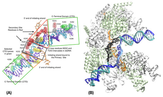 At the other extremity of the protein chain, the disordered C-terminal tail, represented in white to blue shadings in Figure 3A, was the object of specific MD simulations aimed at understanding how the tail mediates the observed influence of magnesium concentration on the rate of dsDNA uptake [103] and strand exchange [15]. The tail was found to remain mostly disordered and to transiently interact with the RecA ATP-binding core, C-terminal or N-terminal regions [15,104]. In the filament, the C-terminal tails appeared to participate in inter-subunit interactions by simultaneously binding regions from adjacent monomers. Interactions with the C-terminal domain transiently overlapped the non-specific DNA binding region where the dsDNA initially enters the filament [87,105], which evokes possible competition for binding that region. Observed interactions between the C-terminal tails and N-terminal linkers [15], or occurrence of transient tail insertion in the secondary DNA binding site inside the filament [104], may be key elements of the tail interference with the HR process.