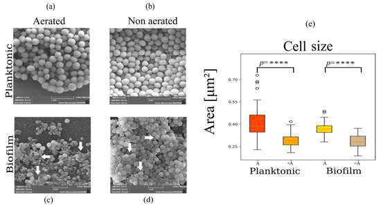 Scanning electron microscopy images show changes in cell morphologies for planktonic (a,b) and biofilm cells (c,d) grown under different aeration conditions. Aerated biofilms show variations in cell morphologies, the production of exopolysaccharides, and the presence of damaged cells, as pointed out by the arrows in (c). Non-aerated biofilms show tightly packed cells covered by a smooth exopolysaccharide structure as pointed out by the arrows in (d). (e) Boxplots showing the mean area of the cells, where open circles show the dispersal of the data points. These data show significant difference in the size between the different growth conditions (**** p < 0.0001).