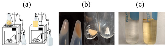 For planktonic cells, significant differences in pigmentation were detected by modifying agitation levels (Figure 2). Total lipid extractions were obtained from these samples. The oxygen-restricting culture always showed a lower OD than the aerated culture which agrees with a lower cell count, as expected under non-aerated conditions. In the case of biofilms, a variation in the experimental set up, introducing aeration of the feeding media (Figure 2a), induced changes in cell pigmentation and biomass, showing a remarkable loss in pigmentation and reduction of biofilm mass under oxygen-restricting conditions (Figure 2b,c). Total lipids were extracted from the samples following the protocol in [6,8]. Lipid yields for biofilm samples were significantly lower due to the high amount of protein in the samples.