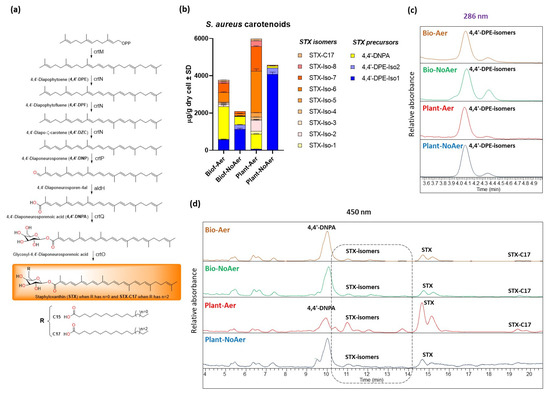 Carotenoids analyzed using LC-DAD-APCI-MS/MS from biofilms and planktonic S. aureus cells. (a) Biosynthetic pathway for carotenoids in S. aureus (b) Carotenoid concentration in μg/g dry S. aureus cell. (c) Chromatogram of 4,4′-Diapophytoene isomers at 286 nm. (d) Chromatogram of carotenoids at 450 nm.