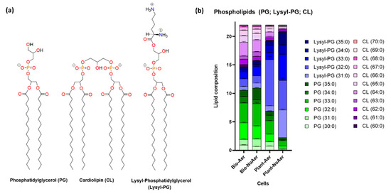 Figure 4 and Table S1 shows an analysis of the main phospholipid components of S. aureus, PG, CL, and Lysyl-PG for biofilms and planktonic cells. The chemical structure of the three phospholipid species is shown in Figure 4a. PG is an anionic phospholipid with the negative charge in the phosphate group at physiological pH with a glycerol attached at the headgroup side of the molecule. CL has two anionic phosphates attached through a glycerol group, and a total of four acyl chains.