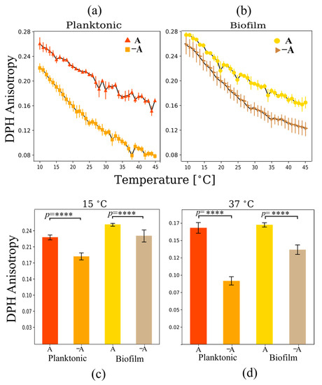 DPH anisotropy as a function of the temperature for multilamellar vesicles from lipid extracts of planktonic and biofilm systems for (a) planktonic and (b) biofilm growth states. Changes in DPH anisotropy at (c) 15 °C and (d) 37 °C under planktonic and biofilm growth conditions in the presence and absence of aeration. The anaerobic samples showed lower levels of lipid packing in the liquid-crystalline phase temperature regime. **** p < 0.0001.