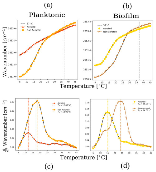 FTIR spectroscopy as a function of temperature for multilamellar vesicles from lipid extracts of planktonic and biofilm systems. Peak position of the symmetric CH2 stretching vibration band of the acyl chains as a function of temperature for (a) biofilms, and (b) planktonic cells under different aeration levels. In (c,d) the first derivative of the wavenumber as a function of temperature is plotted for the different systems, showing in general that the liquid-crystalline to gel phase transition temperature decreases under aerated conditions.