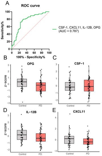 Expression levels of a combination of inflammatory proteins are significantly different in PD patients, compared to healthy controls based on binary logistic regression analysis. A subset of 4 different proteins, i.e., OPG (exp(B) = 0.09; Wald = 12.39), CSF-1 (exp(B) = 41.34; Wald = 6.79), IL-12B (exp(B) = 0.44; Wald = 5.24), and CXCL11 (exp(B) = 0.50; Wald = 6.38), could discriminate PD patients from controls. Panel (A) shows the ROC curve and panel (B–E) shows the expression levels of the individual proteins in PD and controls.