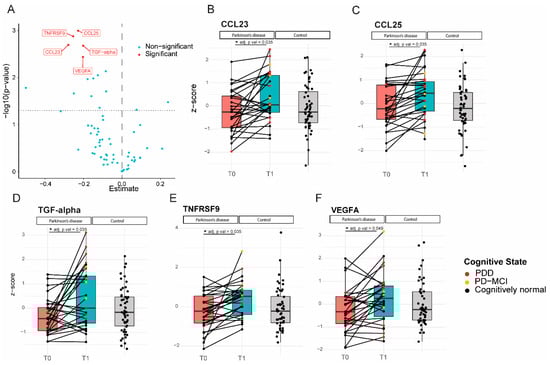 Levels of inflammatory proteins increased significantly in Parkinson’s patients over 7–10 years of follow-up. (A): Volcano plot; p-value versus the magnitude of change; (B–F): Expression profiles of all 5 proteins that increased over time for each individual subject at the two different time points, relative to the expression levels of the control subjects. CCL23, TGF-alpha, and TNFRSF9 levels (C,D,F) were higher in cognitively impaired subjects (PD-MCI and PDD) compared to cognitively normal PD patients. * = p value < 0.05.
