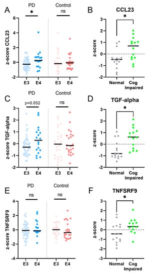PD patients, but not controls, with the APOE4 genotype showed increased levels of plasma CCL23 (A) and a trend for an increased level of TGF-alpha (C), but not of TNFSRF9 (E). PD patients who were cognitively impaired at follow-up had higher levels of CCL23, TGF-alpha, and TNFRSF9, compared to PD patients who remained cognitively unaffected (panel B,D,F). Legend: E3 = apolipoprotein E3 genotype; E4 = apolipoprotein E4 genotype. * = p value < 0.05; ns = non-significant.