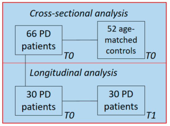The disease duration was calculated based on a subjective estimate of the time since the first occurrence of the characteristic PD motor symptoms. The Unified Parkinson’s Disease Rating Scale part III (UPDRS-III) and the Hoehn and Yahr (HY) classification were used to quantify the severity of parkinsonism and disease stage, respectively, and were assessed in the “on” state. The education level was determined using the Verhage score which ranges from level 1 (elementary school not finished) to 7 (university). Cognitive status was examined using the MMSE at the baseline (T0). At follow-up (T1), an extensive neuropsychological examination was performed and resulted in a diagnosis of ‘normal cognitive status’, ‘PD with mild cognitive impairment’ (PD-MCI), or ‘PD with dementia’ (PDD). PD-MCI was diagnosed if the performance on at least two neuropsychological tests in at least one cognitive domain was impaired (i.e., >1.5 SD below normative means) [47,48]. PDD was diagnosed if test scores were >2 SD below normative means in ≥2 domains. In addition, the Levodopa Equivalent Daily Dose (LEDD) was calculated for each patient as described elsewhere [49]. For the present study, we only included the data of PD patients of whom blood-derived EDTA plasma samples as well as extensive neuropsychological data at follow-up were available (Figure 5).