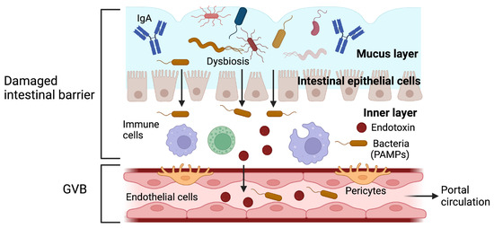 The function of the intestinal barrier after being damaged. Alteration of the intestinal barrier increases in intestinal permeability and facilitates the translocation of bacteria and endotoxins, which can damage the gut–vascular barrier (GVB). The entry of pathogens and pathogen-associated molecular patterns (PAMPs) into the portal circulation triggers an inflammatory response. Gut-derived PAMPs can bind to specific toll-like receptors in the liver and activate the proinflammatory pathways, which result in hepatic inflammation. Adapted from ref. [4]. Created by BioRender (accessed on 29 August 2023).