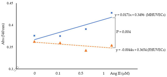 Linear regression analysis of the effect of angiotensin II on the viability of MHUVECs (light blue) and FHUVECs (orange). Data are reported as mean ± SD of at least 5 subjects per sex.