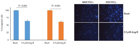 In basal conditions, male and female HUVECs did not present any significant difference in the number of migrated cells (4983 ± 472 cells in FHUVECs and 6630 ± 760 in FHUVEC, n = 5 for each sex; p = 0.79). In both male and female HUVECs, treatment with Ang II significantly reduced migration to a similarl degree (by about 35% and 40% in MHUVECs and FHUVECs, respectively) (Figure 2).