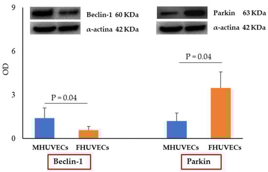 The protein concentration was quantified using the BCA protein assay kit (Thermo Scientific, Waltham, MA, USA). For the Western blot analysis, 25 μg of solubilized protein was electrophoretically resolved by 4–15% SDS-PAGE (100 V, 2 h, 24 °C) and then transferred to a PVDF membrane (250 mA, 65 min, 4 °C) using a Transblot-turbo system (Bio-Rad, Milano, Italy). The membranes were blocked in 5% (w/v) skim milk (Sigma-Aldrich, Milano, Italy) in 150 mM Tris buffer (Sigma-Aldrich, Milano, Italy) and 20 mM Tris-HCl, pH 7.2 (Sigma-Aldrich, Milano, Italy) at 24 °C for 1 h and then incubated overnight at 4 °C with the following antibodies, all produced in rabbits and diluted at a ratio of 1:1000: α-actin (Sigma-Aldrich, Milano, Italy), LC3 (MBL, Milano, Italy), LAMP1, p62, Beclin-1, and Parkin (Cell Signaling Technology, Milano, Italy). After washing, the blots were incubated for 1 h with horseradish peroxidase (HRP)-conjugated secondary antibody (Cell Signaling Technology, Milano, Italy) (1:2000). Antibody binding was detected using a chemiluminescence reaction (Cell Signalling Technology, Danvers, MA, USA) with the Bio-Rad Chemi Doc instrument (Berkeley, CA, USA). Band volume analysis was performed using the Image Lab 4.0 software (Bio-Rad Laboratories, Berkeley, CA, USA), and densitometric data were normalized on α-actin levels, which did not differ in MHUVECs and FHUVECs [].