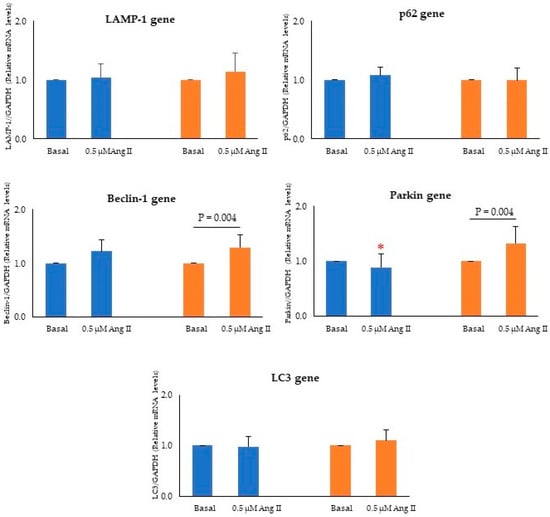 Relative gene expression of LAMP-1, p62, Beclin-1, Parkin, and LC3 in MHUVECs (light blue) and FHUVECs (orange) before and after Ang II treatment. Data are reported as mean ± SD of at least 5 subjects per sex. * p = 0.03 versus Ang II-treated FHUVECs.