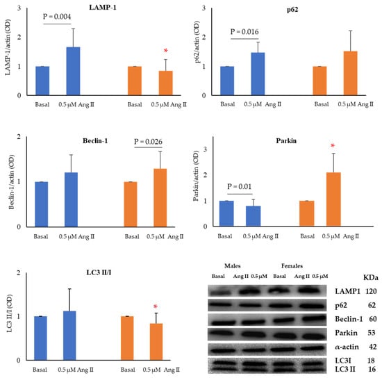 Densitometric analysis and representative Western blotting images of LAMP-1, p62, Beclin-1, and Parkin proteins, and LC3 II/I ratio in MHUVECs (light blue) and FHUVECs (orange) before and after Ang II treatment. Data are reported as mean ± SD, calculated as an increase over the control of at least 5 subjects per sex. * p = 0.03 versus Ang II-treated MHUVECs.