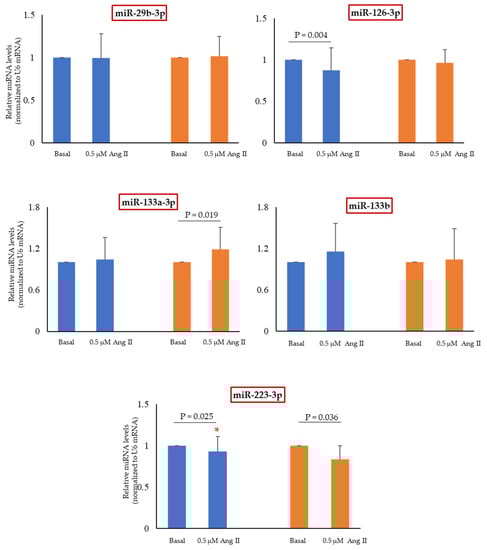 Relative expression of miR-29b-3p, miR-126-3p, miR-133a-3p, miR-133b, and miR-223-3p in MHUVECs (light blue) and FHUVECs (orange) before and after Ang II pre-treatment. Data are reported as mean ± SD of at least 5 subjects per sex. * p = 0.03 versus II-treated female HUVECs.