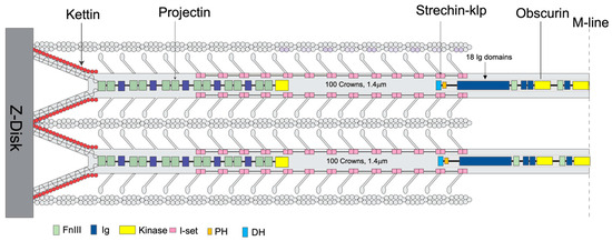 Location of some non-myosin proteins. An illustration of the location of kettin, obscurin, projectin, and stretchin-klp within a sarcomere. The filament tip is mainly bound to projectin, obscurin to the bare zone (M-band), and kettin to the thin filaments and projectin. The stretchin-klp protein binds along the main shaft of thick filaments but not at the bare zones or filament tips. Coloring scheme—Fn3 domains are light green; Ig domains, blue; Ig domains of stretchin-klp, pink; kettin, red; kinase domains, yellow; and DH-PH domains of obscurin, light blue and orange respectively. Adapted from [31,35].