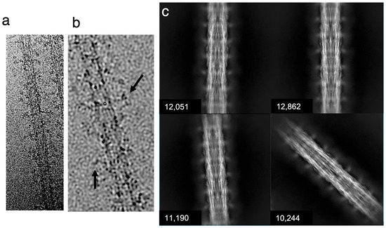 Cryo-EMs of isolated Drosophila thick filaments show fine lines forming longitudinal stripes following the filament axis (Figure 2a,b). These lines are most likely the myosin molecule’s -helical coiled–coiled arrangement, which runs generally parallel to the filament axis [31]. In some locations, myosin layers within the backbone will be oriented edge-on, which would amplify their visibility. No evidence of ordered myosin heads is visible in the motion-corrected images, in contrast to the distinct crown structure seen with Lethocerus thick filaments [30]. Original micrographs suggest that the filaments lack significant density in the central core (Figure 2a), following a pattern visualized in multiple fly species using conventional electron microscopy techniques [45].