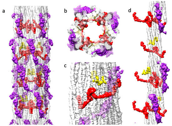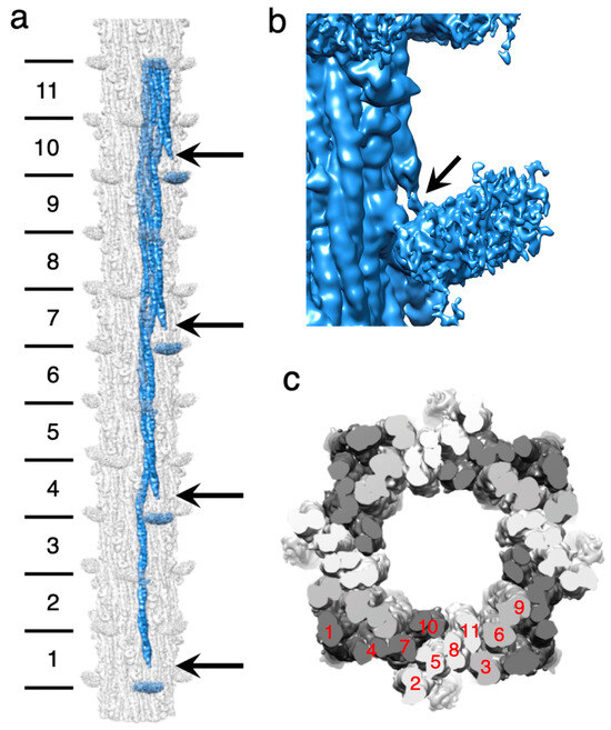 Using single-particle processing methods, 138,000 filament segments (particles) were picked manually for the reconstruction using the Relion manual picker and extracted to obtain filament segments [46]. These segments were subjected to 2D classification to select 116,000 segments of high quality for the final reconstruction. Generally, the class averages showed only a small density that might correspond to the myosin heads and weak density within the filament core, giving the filament a tubular appearance (Figure 2b). Striking axial density variations are seen, which might represent the non-myosin proteins, flightin, myofilin and stretchin-klp, which follow the myosin helical symmetry but are positioned mostly between crowns [31].