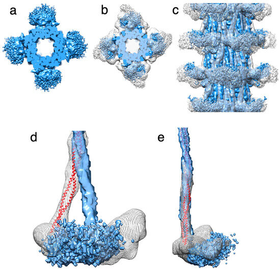The myosin heads are disordered and are represented in the reconstruction as only a shapeless diffuse density that is centered at the location of the RLCs. Absent F-actin, myosin heads can form two types of structures; they can be either individual myosin heads moving independently, or mobile IHMs moving as one structure. The myosin heads in either conformation are disordered in relaxed Drosophila thick filaments and present as a shapeless density (Figure 4a) that does not take on a recognizable shape regardless of the low pass filter level or the density cutoff. When the Drosophila thick filament is superimposed on the Lethocerus thick filament, which has ordered heads, the two densities, one with shape the other without, superimpose (Figure 4b,c). Using the alignment of the two reconstructions based on their very similar backbone density (Figure 4d,e) shows that both proximal S2s originate at the same axial and azimuthal positions on the backbone. However, the Drosophila S2 follows a near-axial path, whereas the similar density in Lethocerus is bent by 17° azimuthally (Figure 4d). In a tangential view revealing the radial disposition, both reconstructions are superimposed (Figure 4e). The proximity of the floating density to the beginning of the proximal S2 suggests that the floating density represents disordered myosin RLCs, as previously suggested for the similar density observed in Bombus [34].