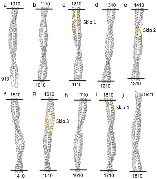 The Drosophila homology model of the myosin tail. The entire myosin tail is shown in 10 segments, each with a length of one crown (100 residues) (a–j). The homology model of the tail starts at residue number 913 and terminates at residue 1921 (The proximal S2 region is not defined at this contour). Numbers at the top and bottom of each segment indicate the starting and ending residue numbers, respectively. The skip residue regions are colored in gold and show a good fit with the density. (c) Skip 1, where the density makes a distinct azimuthal shift. (e) Skip 2, where the density reveals a normal coiled-coil twist. (g) Skip 3, where one chain shows a distinct bend where flightin passes between two myosin tails. (i) Skip 4, where the thin density on one chain indicates that the -helix has unfolded.