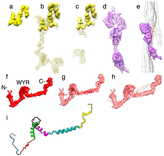 For purposes of description, we define the following elements (Figure 7i): external domain (residues A2-G74) [59], extended-1 (residues Y75-R83), extended-2 (residues H84-Y93), helix-1 (residues K94-Q115), loop-1 (residues T116-T127), helix-2 (residues W128-D144), connector (residues S145-Y166), C-terminal (residues N167-L182). The external domain refers to those observed residues that are outside of the thick filament backbone, a major part of which is not visible and is presumably disordered.