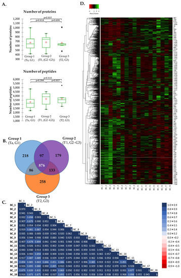 The protein identifications were further filtered to remove reverse sequences (n = 68), proteins identified on only one peptide (n = 159), and yeast ADH. The final report contained 1619 proteins identified based on ≥2 peptides (Supplementary Table S1). A statistically significant difference in abundance (Anova ≤ 0.05) showed 494 proteins (Supplementary Table S2). Significant differential abundance (Mann–Whitney U-test, p ≤ 0.05) in Group 1 vs. Group 2, Group 2 vs. Group 3, and Group 1 vs. Group 3 showed 340, 95, and 482 proteins, respectively (Table 1). After adjusting the p-values for multiple testing using the Benjamini-Hochberg (B-H) procedure and filtering the dataset for B-H p ≤ 0.05, significant differential abundance (Mann–Whitney U-test, p ≤ 0.05) showed 216 proteins (Group 1 vs. Group 2 = 81; Group 2 vs. Group 3 = 0; Group 1 vs. Group 3 = 195). The higher proportion of the differentially abundant proteins were down-regulated.
