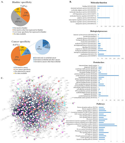 Categorization of the differentially abundant proteins in BCa. (A) Bladder tissue and cancer specificity according to the data from the Human Protein Atlas, based on transcript mRNA detection and specificity. (B) GO annotations of proteins according to the Panther Classification System. (C) Enrichment analysis with STRING: Proteins colored in pink are expressed in the urinary system, while proteins colored in dark green are expressed in the human bladder. The top associated pathways according to the Reactome pathways database were the immune system (red) and neutrophil degranulation (blue), while according to WikiPathways, these were the VEGFA-VEGFR2 signaling pathway (green) and complement system (yellow). Carcinoma was among the top associated diseases (turquoise) according to the STRING database of disease-gene associations.