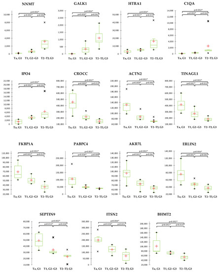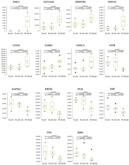 Statistically significant differences between initial (Ta–T1) and advanced (T2–T3) disease stages showed 14 proteins, of which 7 had increased and 7 decreased levels in advanced BCa (Figure 4). Statistically significant increase in advanced BCa showed ER membrane protein complex subunit 2 (EMC2), UDP-glucuronosyltransferase 1A10 (UGT1A10), Estradiol 17-beta-dehydrogenase 2 (HSD17B2), NSFL1 cofactor p47 (NSFL1C), Leucine zipper putative tumor suppressor 2 (LZTS2), Glycine--tRNA ligase (GARS1) and Fanconi anemia group A protein (FANCA). On the other hand, Electron transfer flavoprotein subunit beta (ETFB), Nucleosome assembly protein 1-like 4 (NAP1L4), Keratin_type I cytoskeletal 20 (KRT20), Plastin-1 (PLS1), Lupus La protein (SSB), Thioredoxin (TXN) and Isocitrate dehydrogenase [NADP] cytoplasmic (IDH1) showed statistically significant decrease in advanced BCa.