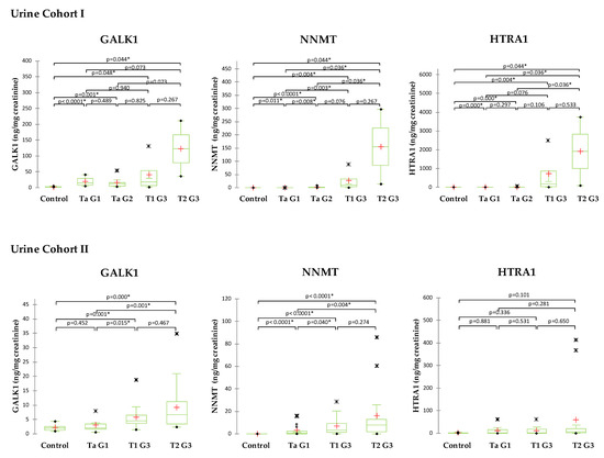 The preselected protein candidates NNMT, GALK1, and HTRA1 were measured in two cohorts of urine samples (Figure 5). The testing in Cohort I showed that all 3 proteins have detectable levels in urine using antibody-based measurements, can discriminate normal controls from BCa patients with statistical significance, and their concentration increases with BCa stage. In addition to discriminating between normal controls and BCa, NNMT showed statistically significant discrimination between initial (Ta, G1) and advanced tumors (T1–T2, G3). As for GALK1 and HTRA1, no significant differences were observed between the BCa stages. The testing in Cohort II validated the findings in regard to NNMT and GALK1 but failed to confirm the HTRA1 differences between BCa and controls. NNMT showed very good statistically significant discrimination between all groups except discrimination between more advanced BCa groups T1 G3 and T2 G3. GALK1 also discriminated most groups with statistical significance, but could not discriminate initial BCa stage (Ta, G1) from normal controls as well as more advanced BCa groups T1 G3 and T2 G3.